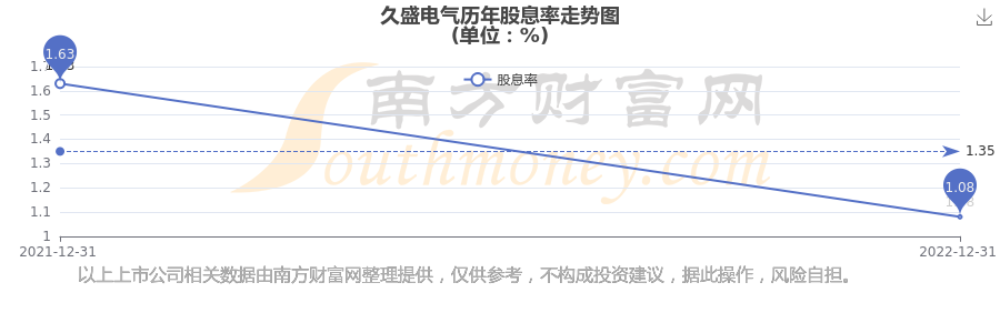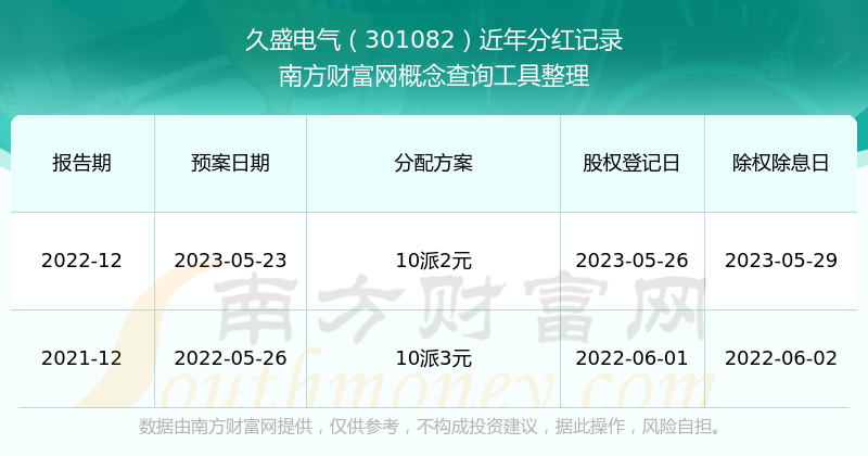 久盛電氣最新一次公布的分紅方案為10派2元。本次權益分派股權登記日為2023年5月26日,除權除息日為2023年5月29日,派息日為2023年5月29日。