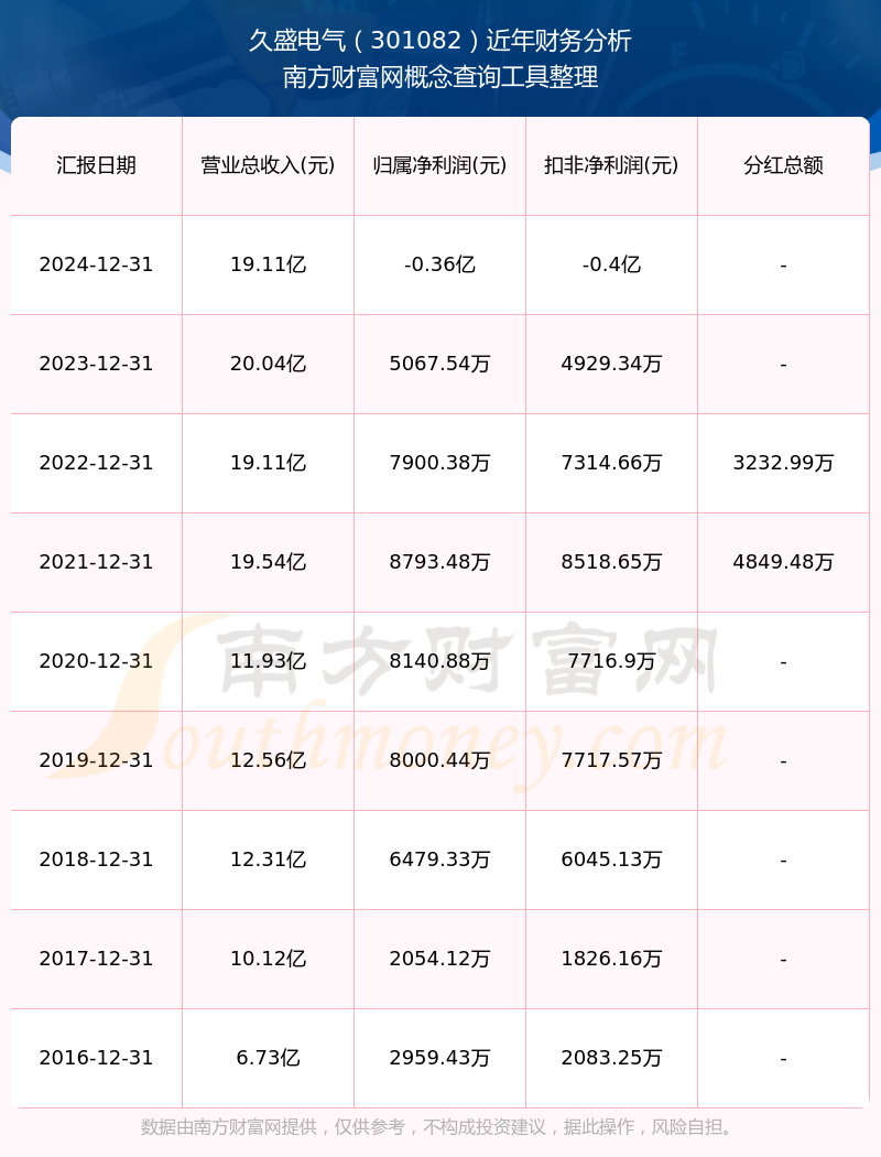 久盛電氣2024年總營收19.11億,同比增長-4.64%;凈利潤-3556.47萬,同比增長-170.18%;銷售毛利率10.91%。