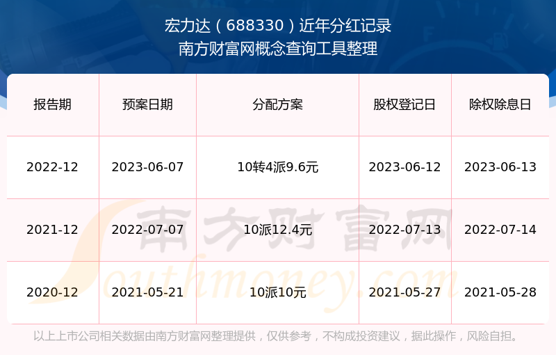 宏力達最新一次公布的分紅方案為10轉4派9.6元。本次權益分派股權登記日為2023年6月12日,除權除息日為2023年6月13日,派息日為2023年6月13日。