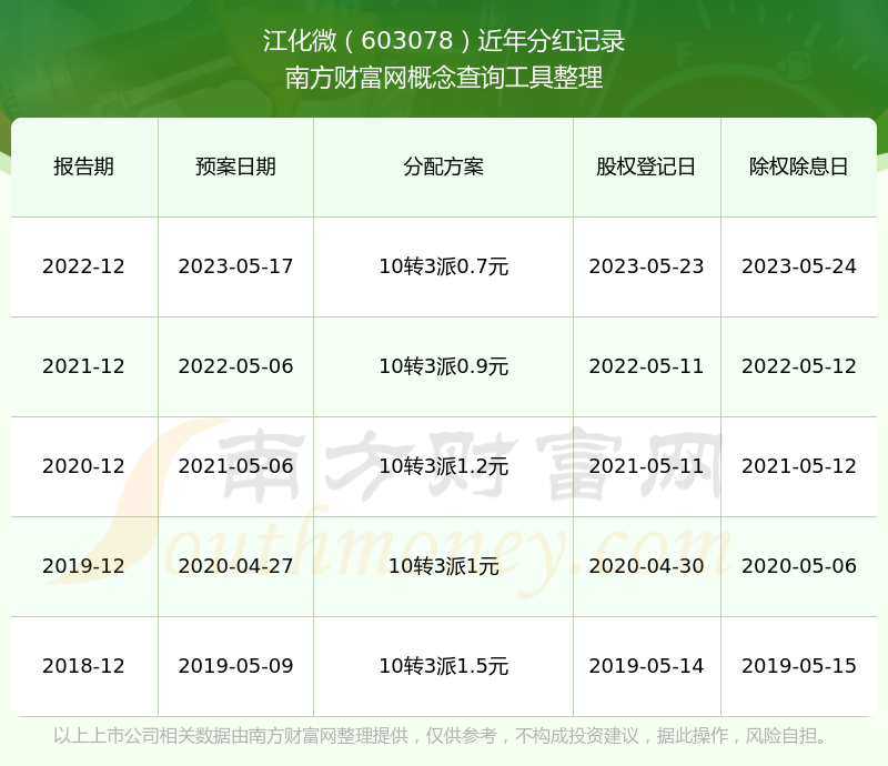 江化微最新一次公布的分紅方案為10轉3派0.7元。本次權益分派股權登記日為2023年5月23日,除權除息日為2023年5月24日,派息日為2023年5月24日。