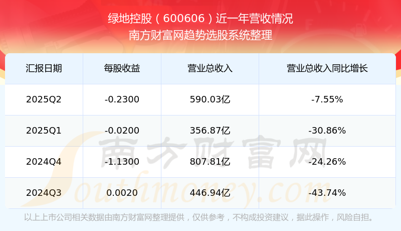 于2025年第二季度,綠地控股披露了其業績表現,其中主營業務收入590.03億元,相較于去年同期-7.55%。此外,公司歸屬于母公司的凈利潤為-32.59億元,同比增長了-2653.7%。在扣除所有非經常性損益后,凈利潤-29.4億元,同比增長-2680.05%。