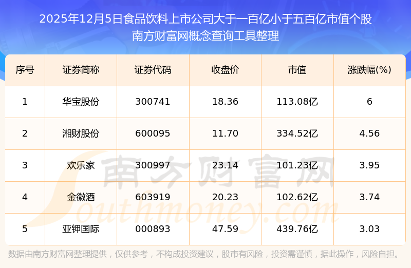 截止2025年12月5日,食品飲料上市公司市值大于一百億小于五百億的個股共有5只。其中,市值較高的有亞鉀國際、湘財股份、華寶股份,市值分別為439.76億元、334.52億元、113.08億元。