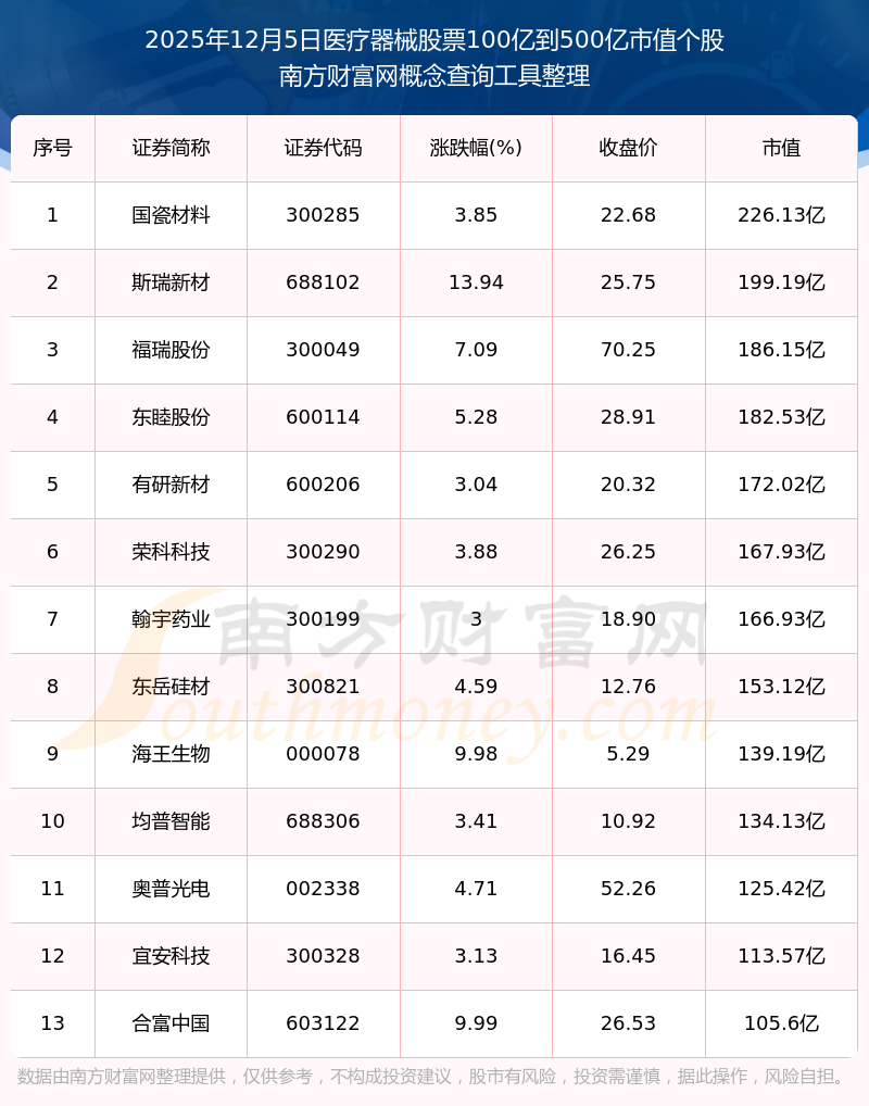 截止2025年12月5日,醫(yī)療器械股票市值100億到500億的個(gè)股共有13只。其中,市值較高的有國瓷材料、斯瑞新材、福瑞股份,市值分別為226.13億元、199.19億元、186.15億元。
