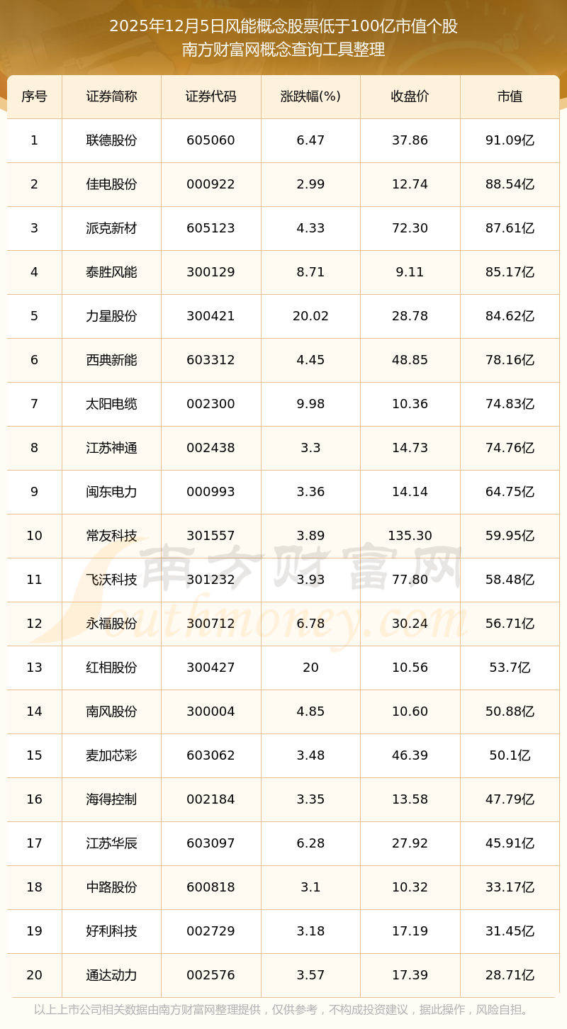 截止2025年12月5日,風能概念股票市值低于100億的個股共有21只。其中,市值較高的有聯德股份、佳電股份、派克新材,市值分別為91.09億元、88.54億元、87.61億元。