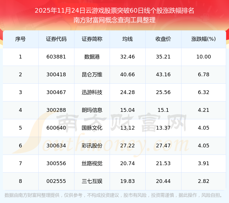 根據南方財富網概念查詢工具數據統計,截止2025年11月24日收盤,云游戲股票共有8只個股收盤價向上突破了60日線。其中漲幅較大的個股有數據港、昆侖萬維、迅游科技等,漲幅分別為10.00%、6.78%、6.32%。