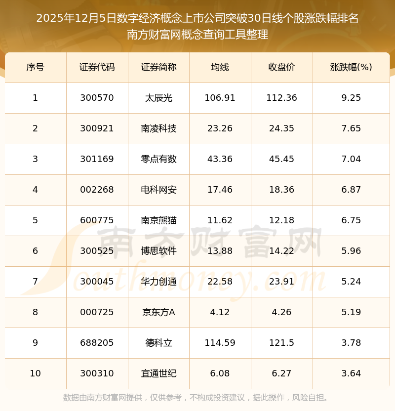 根據(jù)南方財(cái)富網(wǎng)概念查詢工具數(shù)據(jù)統(tǒng)計(jì),截止2025年12月5日收盤,數(shù)字經(jīng)濟(jì)概念上市公司共有12只個(gè)股收盤價(jià)向上突破了30日線。其中漲幅較大的個(gè)股有太辰光、南凌科技、零點(diǎn)有數(shù)等,漲幅分別為9.25%、7.65%、7.04%。