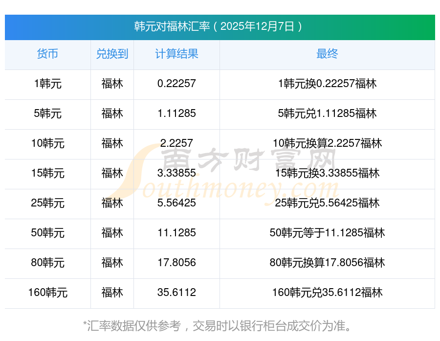 今天匯率更新!2025年12月7日4韓元兌換福林是多少?