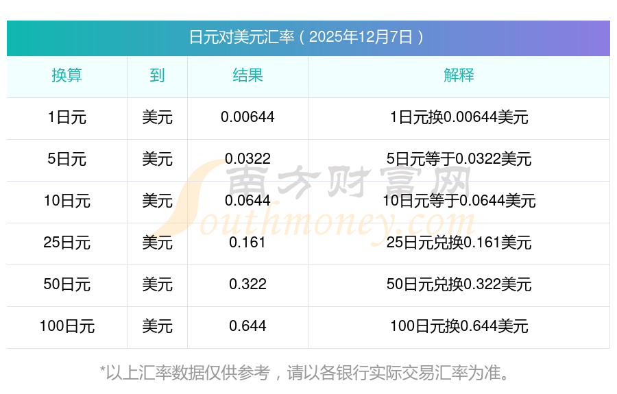2025年12月7日日元與美元的兌換匯率計算如下: