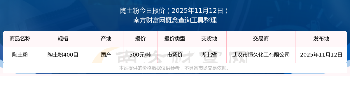 2025年11月12日,陶土粉(陶土粉400目)市場價(jià)價(jià)格為500.00元/噸,報(bào)價(jià)人:武漢市恒久化工有限公司,交易地點(diǎn)為湖北省。