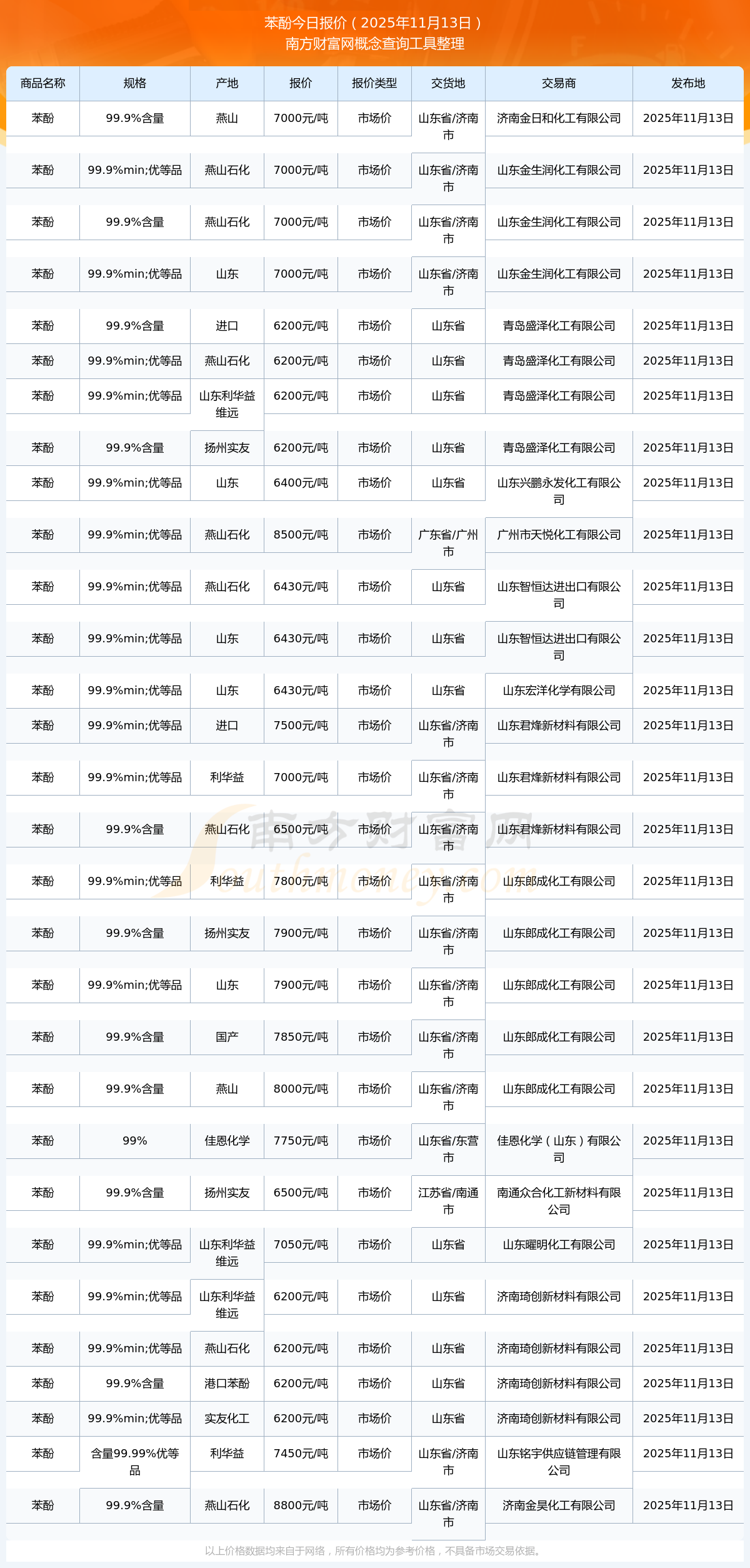 2025年11月13日,山東金生潤化工有限公司苯酚(99.9%含量),燕山石化,交易地點(diǎn)為山東省/濟(jì)南市,報價為7000.00元/噸。