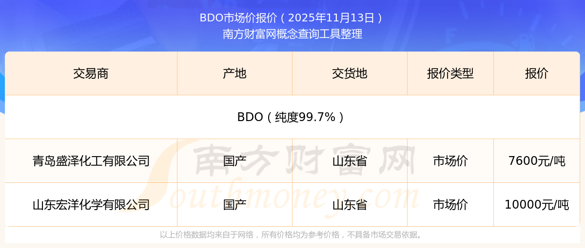 2025年11月13日,山東宏洋化學有限公司BDO(純度99.7%),國產,交易地點為山東省,市場價報價為10000.00元/噸。