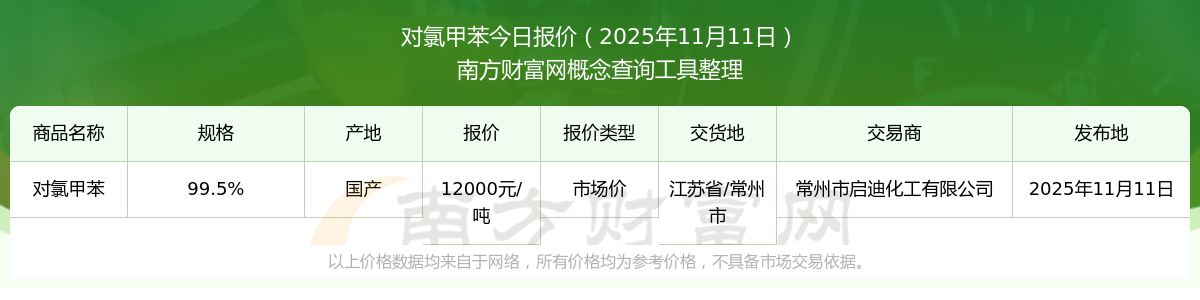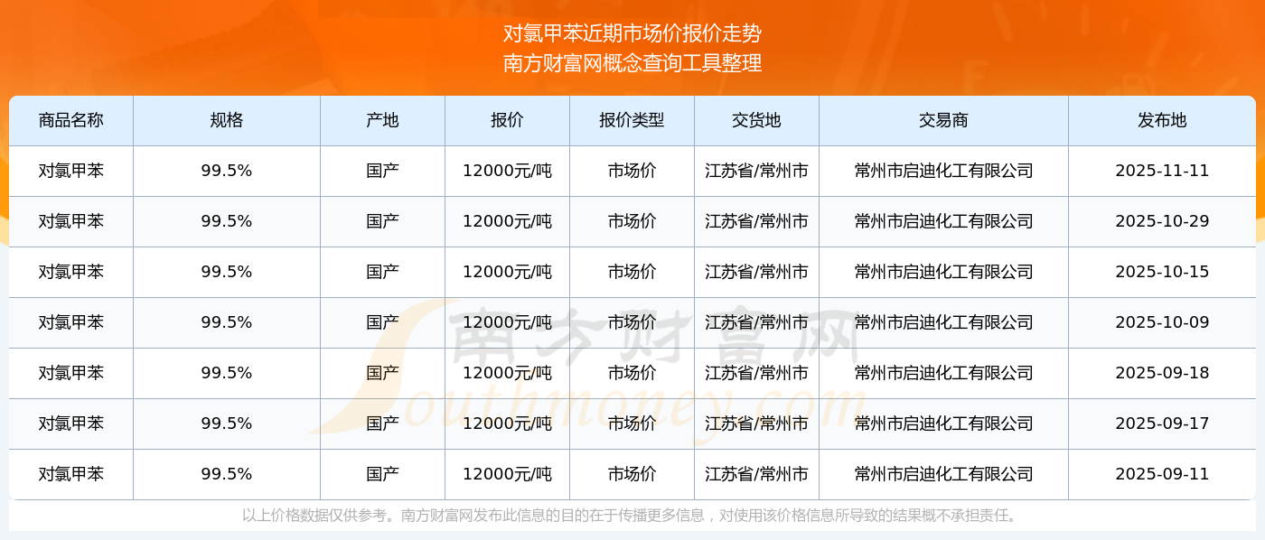 2025年11月11日,常州市啟迪化工有限公司對氯甲苯(99.5%),國產,交易地點為江蘇省/常州市,市場價報價為12000.00元/噸。