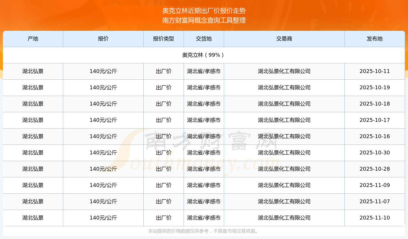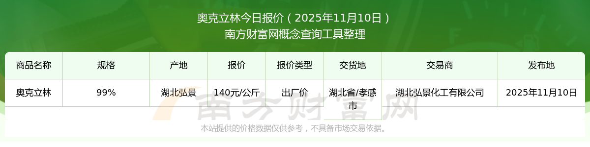 2025年11月10日,奧克立林(99%)出廠價(jià)價(jià)格為140.00元/公斤,報(bào)價(jià)人:湖北弘景化工有限公司,交易地點(diǎn)為湖北省/孝感市。