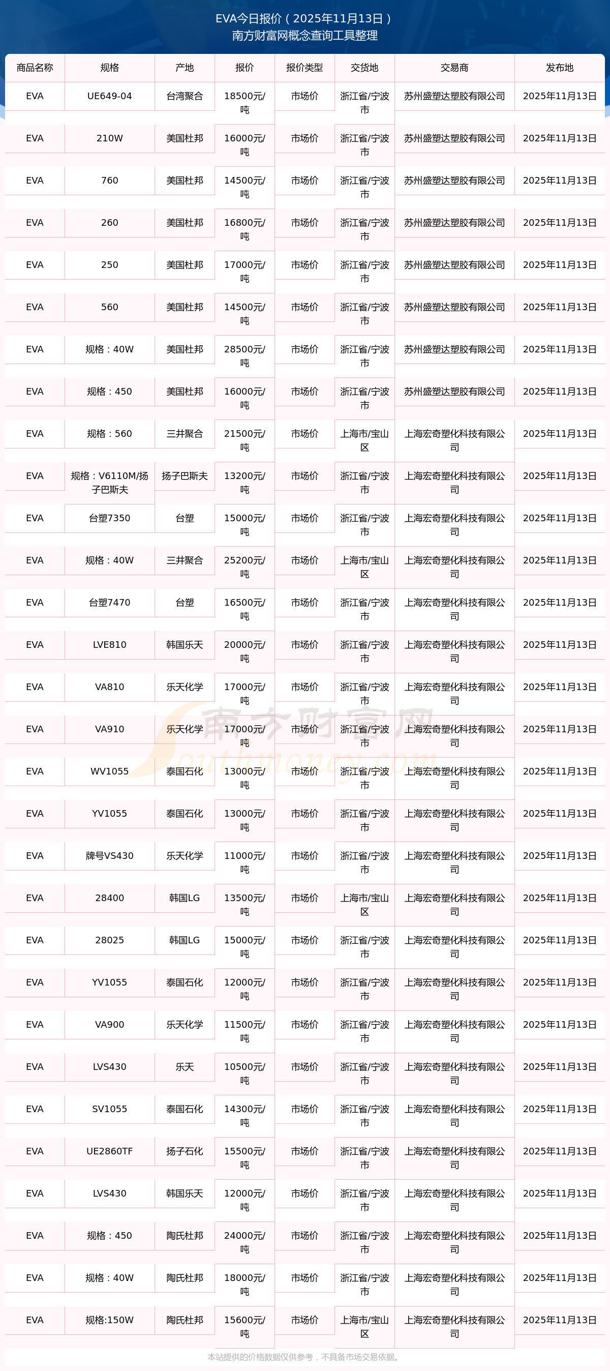 2025年11月13日,EVA(210W)價格為16000.00元/噸,報價人:蘇州盛塑達塑膠有限公司,交易地點為浙江省/寧波市。