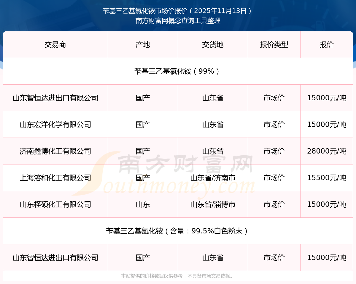 2025年11月13日,芐基三乙基氯化銨(含量:99.5%白色粉末)市場價價格為15000.00元/噸,報價人:山東智恒達(dá)進(jìn)出口有限公司,交易地點為山東省。