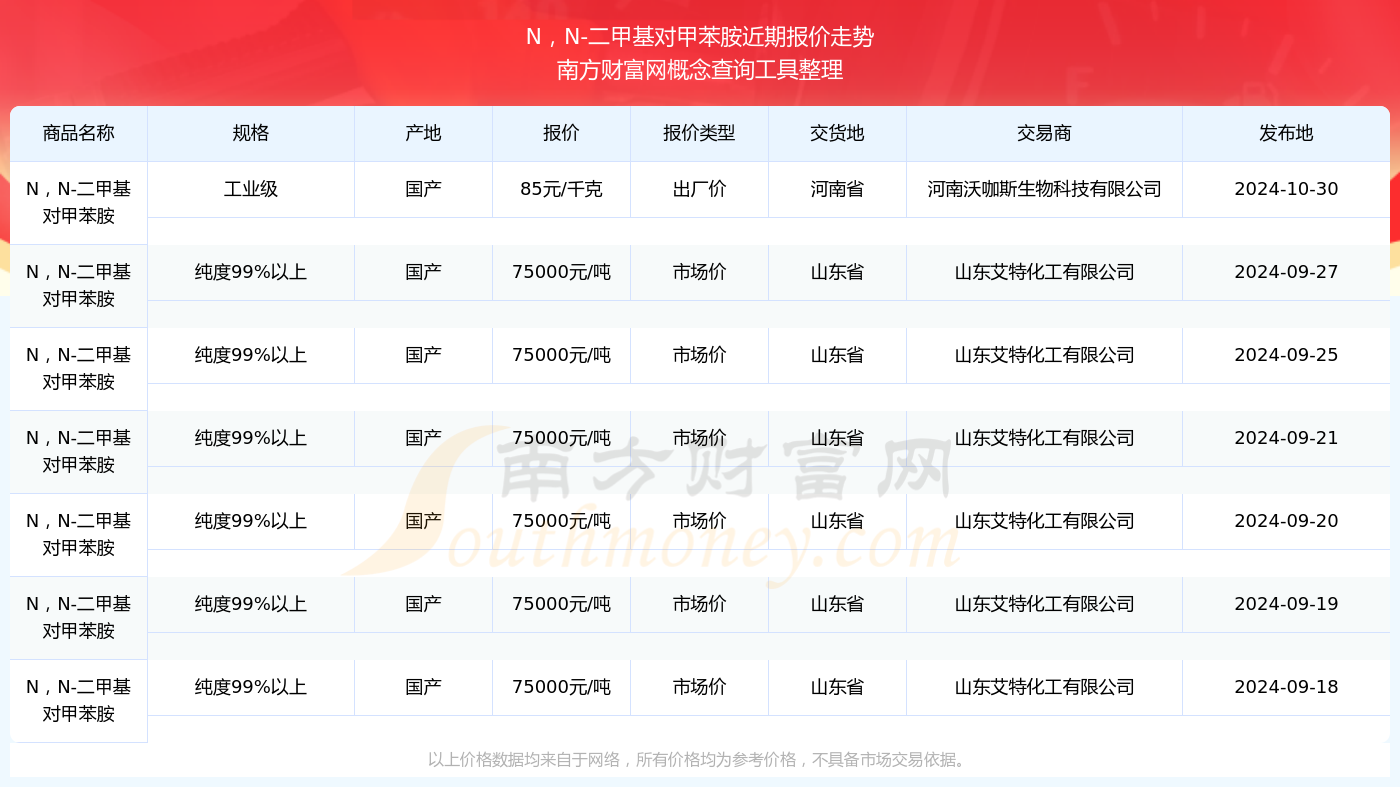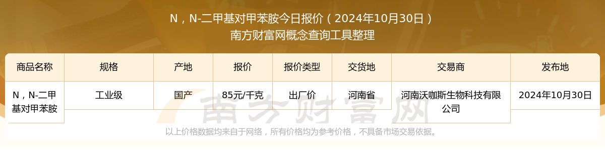 2024年10月30日,河南沃咖斯生物科技有限公司N,N-二甲基對甲苯胺(工業級),國產,交易地點為河南省,報價為85.00元/千克。