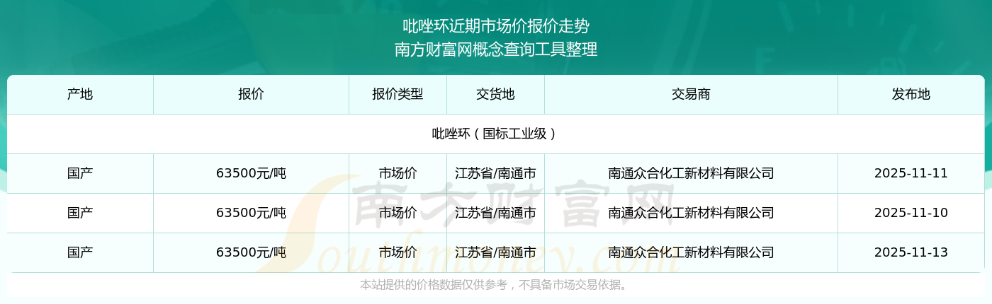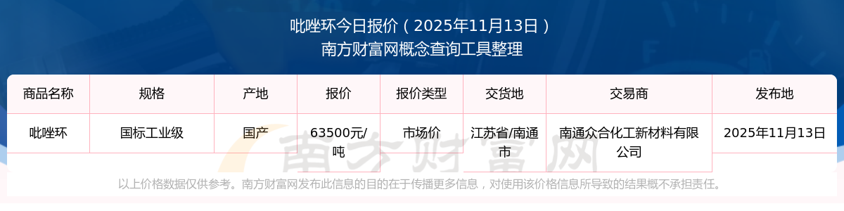 2025年11月13日,吡唑環(huán)(國(guó)標(biāo)工業(yè)級(jí))市場(chǎng)價(jià)價(jià)格為63500.00元/噸,報(bào)價(jià)人:南通眾合化工新材料有限公司,交易地點(diǎn)為江蘇省/南通市。