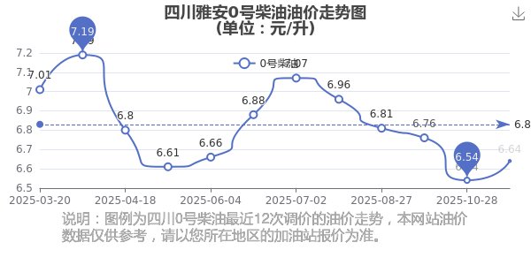 11月14日四川雅安汽油、柴油價格是多少錢一升?11月11日調整后,92號汽油為7.04元,上調了0.1元,上調幅達1.44%;95號汽油為7.53元,上調了0.11元,上調幅達1.48%;89號汽油為6.54元,上調了0.1元,上調幅達1.55%;0號柴油為6.64元,上調了0.1元,上調幅達1.53%。下一輪油價調整時間11月24日24時,距離現在還有10.71天。