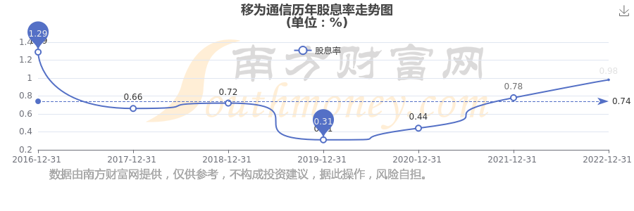 移為通信最新一次公布的分紅方案為10派1.2元。本次權益分派股權登記日為2023年6月13日,除權除息日為2023年6月14日,派息日為2023年6月14日。