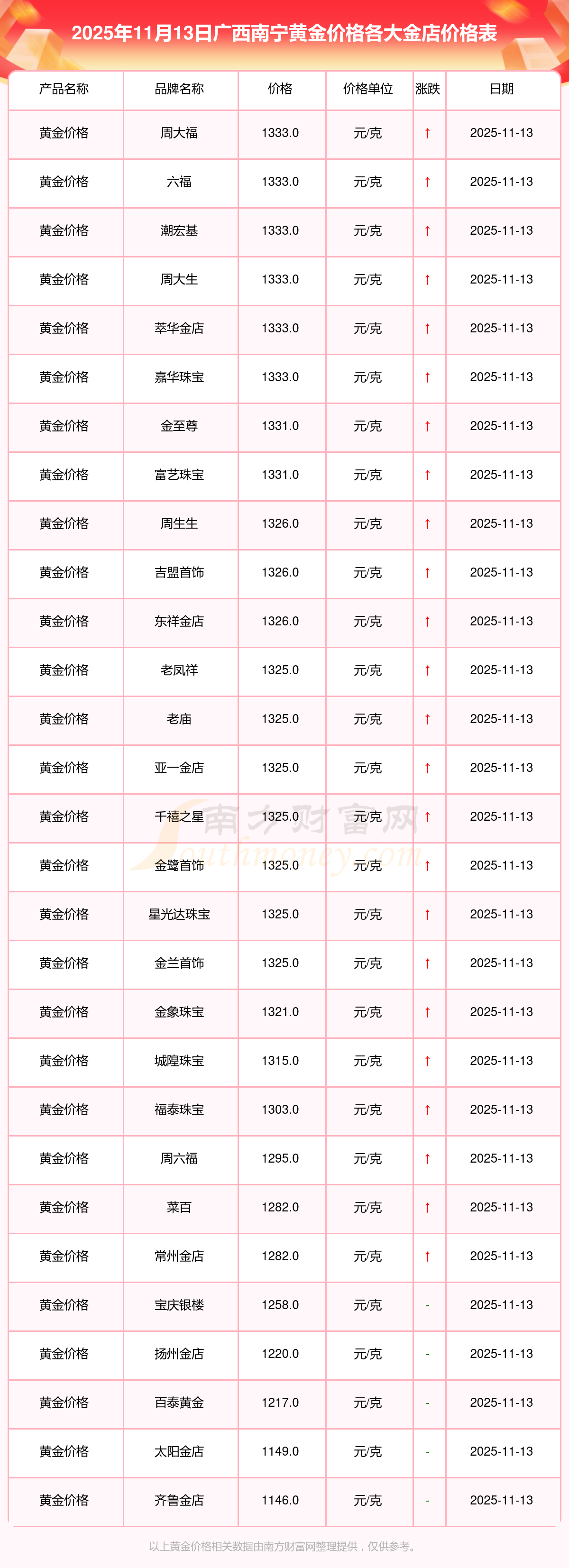 今天是2025年11月13日,廣西南寧周大福、周大福、周大福、周大福、周大福、周大福、周大福、老鳳祥、老鳳祥、老鳳祥、周六福等各大金店品牌黃金價格最新價格如下:周大福1333.0元/克、周大福656.0元/克、周大福1333.0元/克、周大福46420.0、周大福18680.0、周大福41870.0、周大福1167.0元/克、老鳳祥1325.0元/克、老鳳祥600.0元/克、老鳳祥1325.0元/克、周六福1295.0元/克。