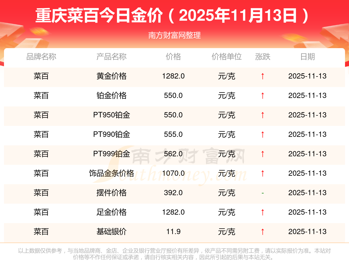 2025年11月13日重慶菜百一克黃金的售價是多少:黃金價格1333.0元/克,鉑金價格656.0元/克,飾品金價(內地)1333.0元/克,黃金飾品(香港)46420.0,鉑金價格(香港)18680.0,金條價格(香港)41870.0,金條金價(內地)1167.0元/克,黃金價格1325.0元/克,鉑金價格600.0元/克,足金價格1325.0元/克,黃金價格1295.0元/克。
