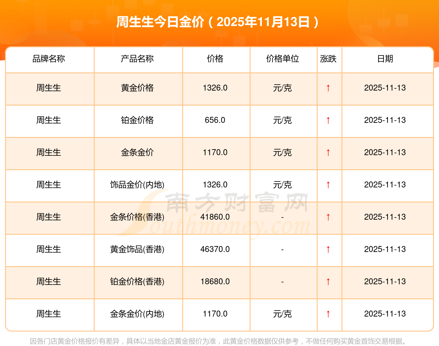 2025年11月13日,周大福、周大福、周大福、周大福、周大福、周大福、周大福、老鳳祥、老鳳祥、老鳳祥、周六福等各大金店品牌飾品金價(內地)今日價格如下:周大福1333.0元/克、周大福656.0元/克、周大福1333.0元/克、周大福46420.0、周大福18680.0、周大福41870.0、周大福1167.0元/克、老鳳祥1325.0元/克、老鳳祥600.0元/克、老鳳祥1325.0元/克、周六福1295.0元/克。