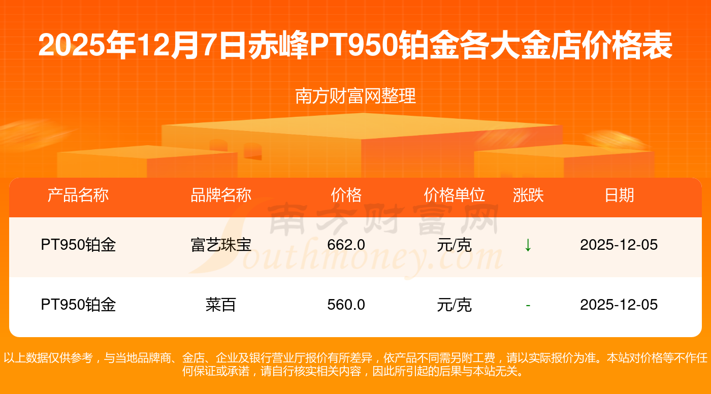 2025年12月7日,赤峰周大福、周大福、周大福、周大福、周大福、周大福、周大福、老鳳祥、老鳳祥、老鳳祥、周六福等各大金店品牌PT950鉑金今日價格行情最新來了:周大福1328.0元/克、周大福662.0元/克、周大福1328.0元/克、周大福46550.0、周大福18970.0、周大福41990.0、周大福1165.0元/克、老鳳祥1325.0元/克、老鳳祥600.0元/克、老鳳祥1325.0元/克、周六福1289.0元/克。