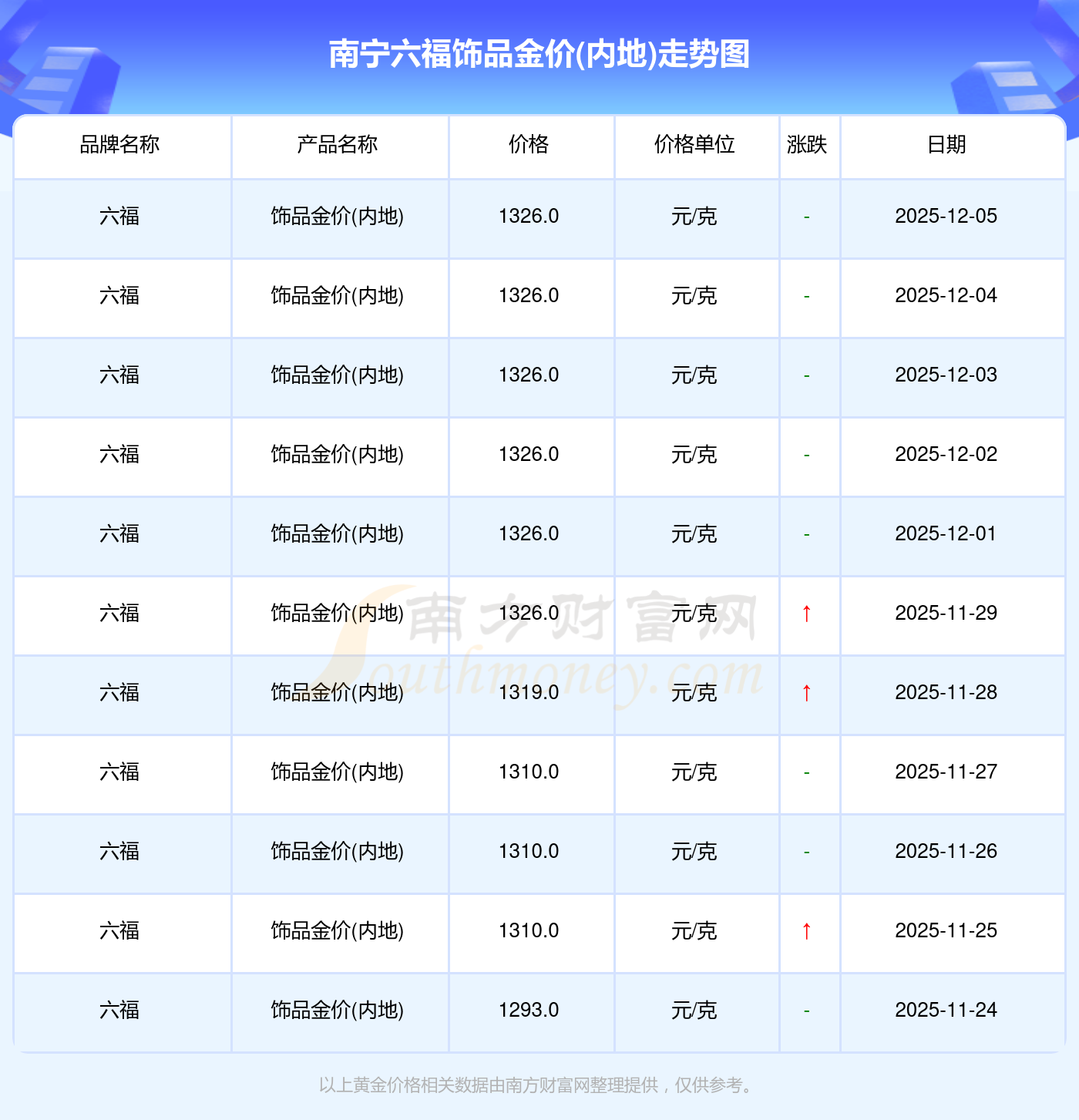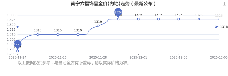 今日南寧六福飾品金價(內地)最新價格是1326.0元/克。