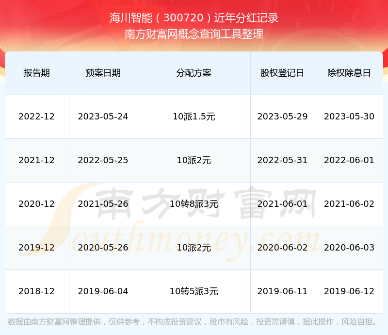 海川智能最新一次公布的分紅方案:10派1.5元。