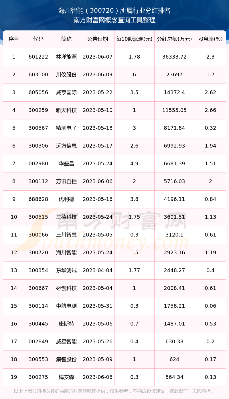 按照南方財富網趨勢選股系統統計,海川智能所屬行業為計量設備行業,計量設備行業分紅排名情況如下表: